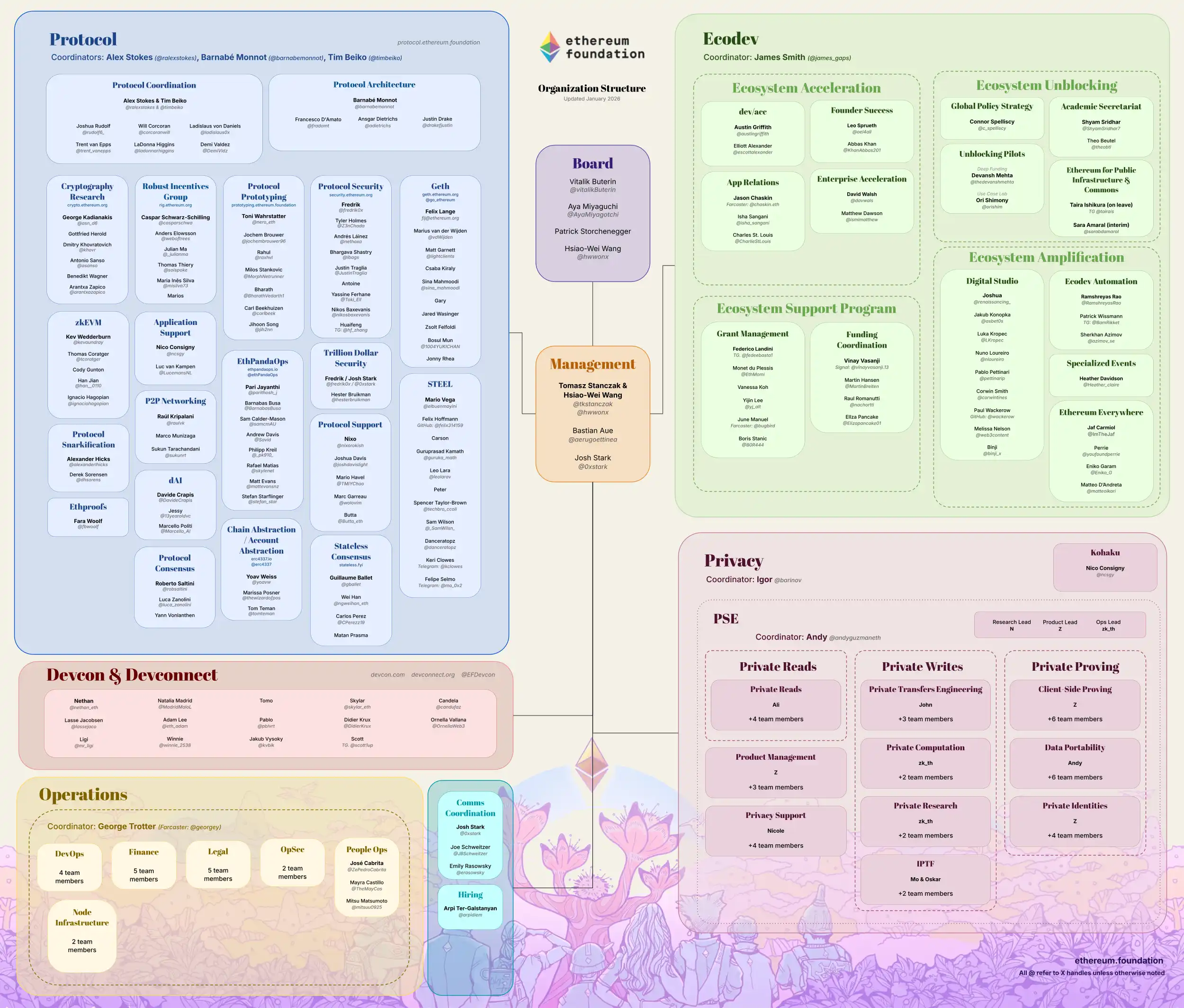 以太坊基金會完整的組織架構,dAI 團隊與隱私、擴容團隊並列為核心戰略方向