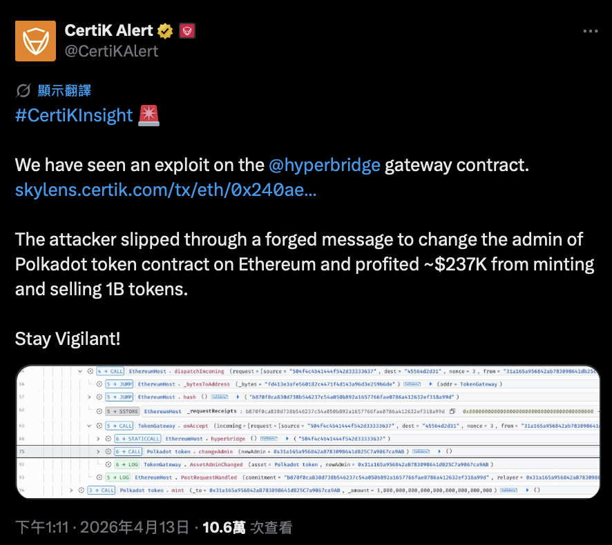 駭客利用 Hyperbridge 跨鏈橋漏洞,憑空鑄造 10 億枚 DOT 代幣,面額價值雖達 11.9 億美元,卻因市場流動性嚴重不足,最終僅套現約 23.7 萬美元。