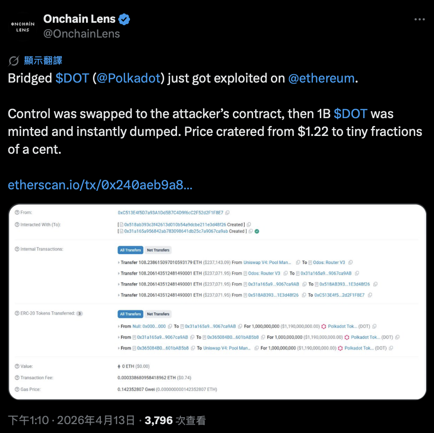 被接受的訊息隨即執行對橋接 Polkadot 代幣合約的 changeAdmin 功能,將管理員權限轉移給攻擊者的地址。取得管理權後,攻擊者在單筆交易中鑄造了 10 億枚 DOT 代幣,並透過 Odos Router V3 將這些代幣倒入 Uniswap V4 的 DOT-ETH 交易池,以略微不同的價格進行多次兌換後,最終提取約 108.2 枚以太幣。