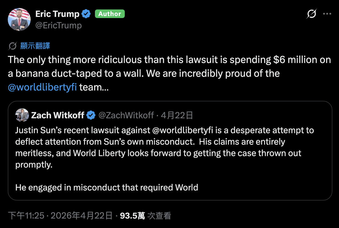 隨著爭議擴大,川普家族成員也加入戰局。川普的次子艾瑞克・川普(Eric Trump)在社群媒體上公開駁斥孫宇晨的訴訟,這隨即引發了加密社群的激烈辯論。