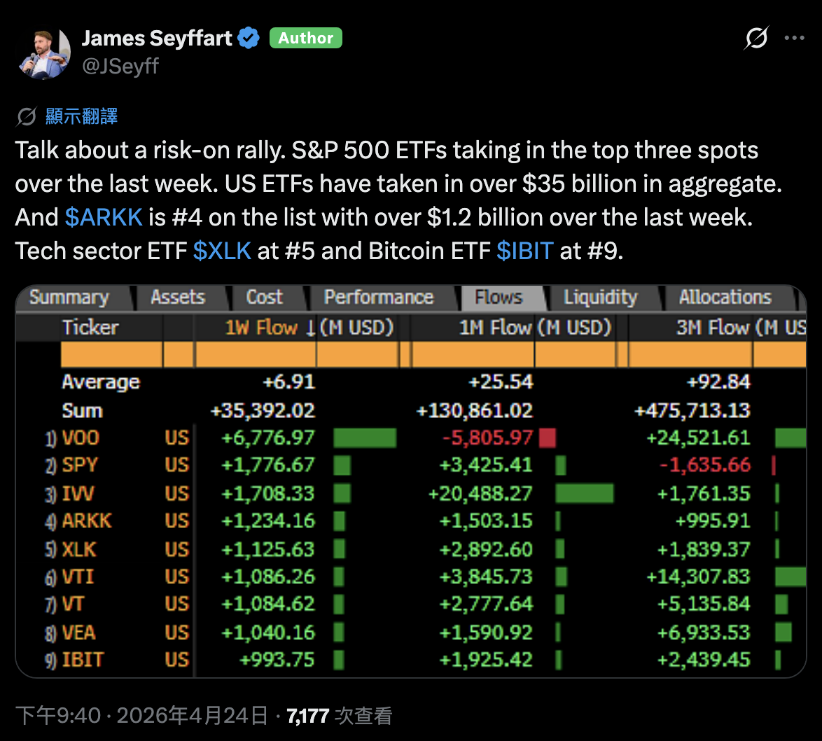 貝萊德(BlackRock)旗下的 IBIT 比特幣現貨 ETF 在 2026 年 4 月下旬展現出驚人的吸金能力。根據《彭博社》分析師 James Seyffart最新的市場數據顯示,該基金已正式躋身全美 ETF 週流入量的前十名行列。在截至 4 月 24 日的單週內,IBIT 錄得約 9.94 億美元的資金淨流入,成功位居全美第九。