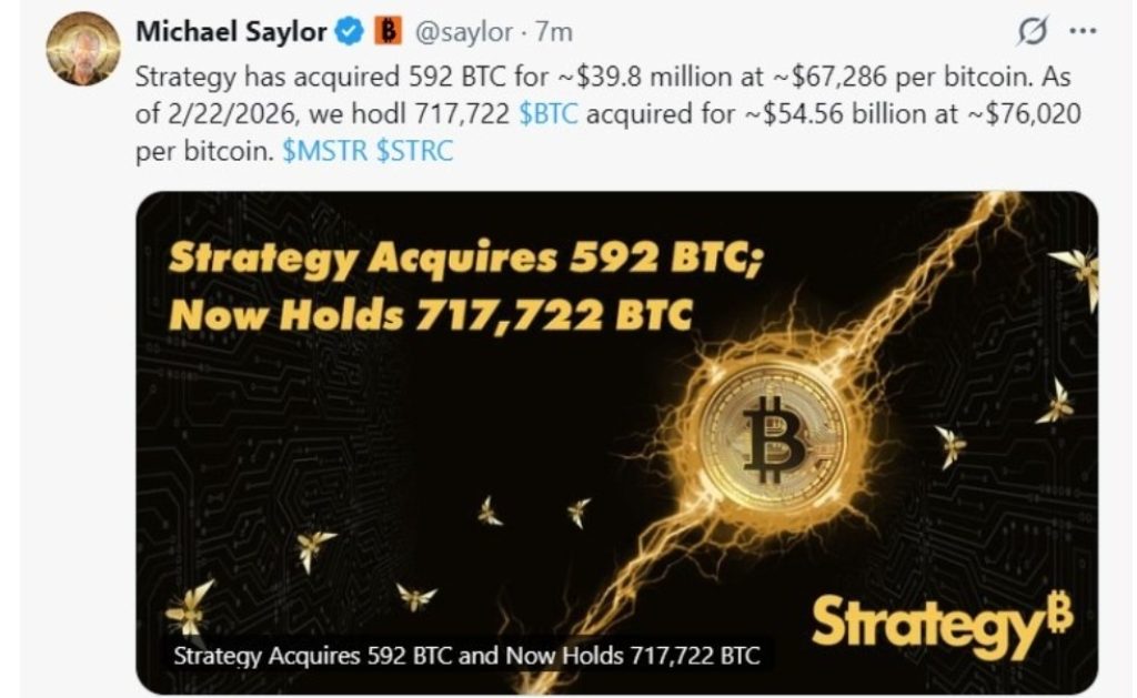 根据最新的加密货币新闻,Michael Saylor的策略已购买了592个比特币,花费约4000万美元,完成了其第100个比特币的购买。此次最新购买使其总持有量升至717,722个比特币。