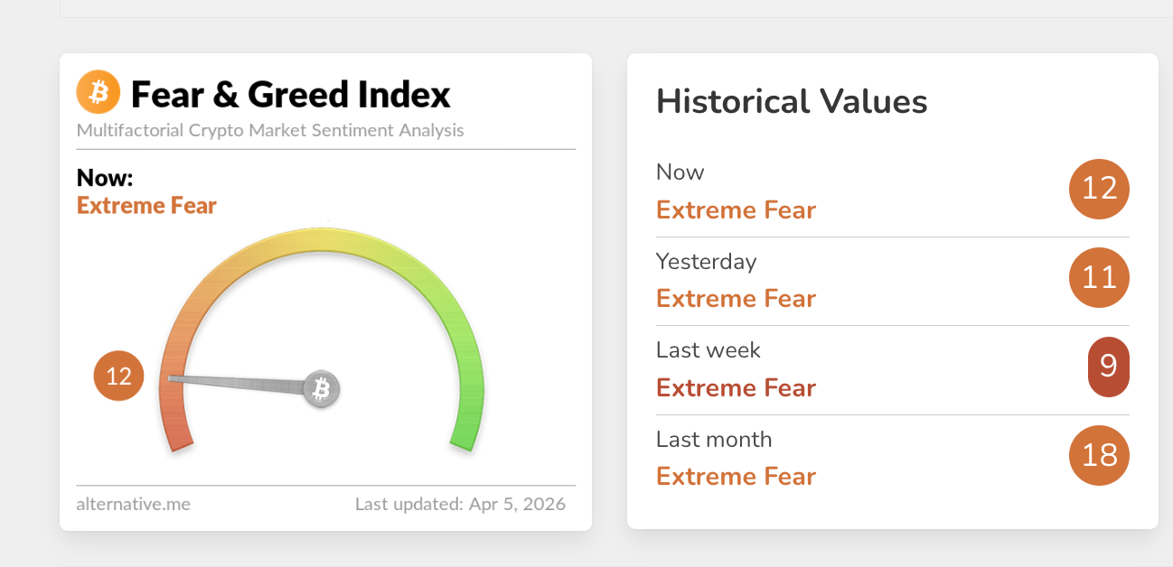 深潮 TechFlow 消息,04 月 05 日,据 Alternative 数据显示,今日加密货币恐慌与贪婪指数升至 12,昨日该指数为 11,市场仍处于「极度恐慌状态」。